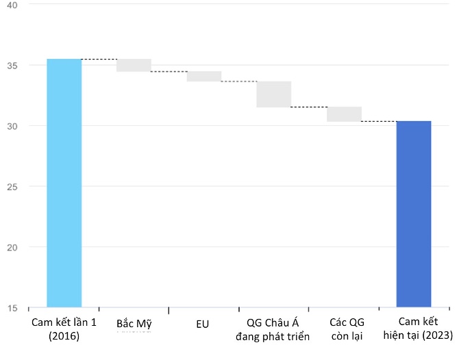Hình 2. Thay đổi trong cam kết của các quốc gia về phát thải CO2 từ tiêu thụ năm lượng vào năm 2030 (tỷ tấn)