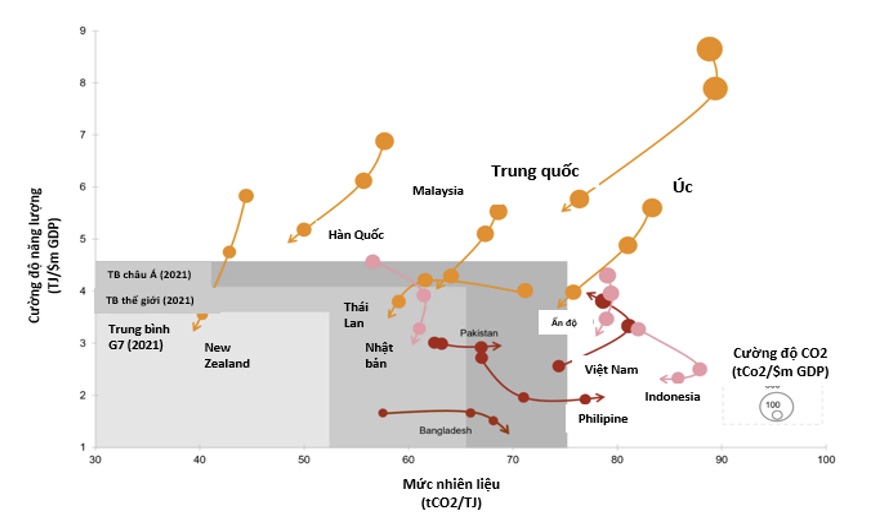 * Trục tung: cường độ sử dụng năng lượng, cho thấy việc cần phải sử dụng bao nhiêu năng lượng để tạo ra 1 đồng GDP; Trục hoành: hệ số nhiên liệu, cho thấy mức phát thải trên mỗi tấn nhiên liêu, độ lớn của hình tròn: Đo lường bao nhiêu phát thải CO2 trên từng đơn vị năng lượng tiêu thụ, cho thấy mức độ xanh của năng lượng tiêu thụ. Tối ưu: Góc trái dưới.