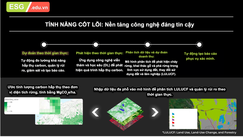 Tự động đo lường khả năng hấp thụ carbon, quản lý rủi ro, giám sát và tạo báo cáo.
