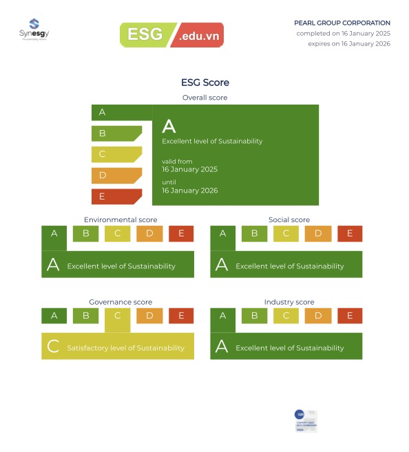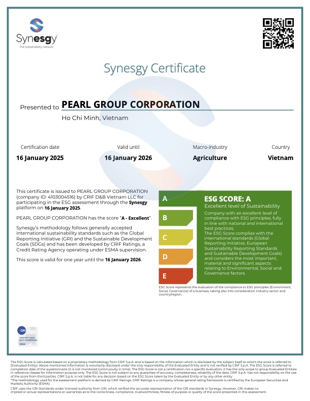 ESG Education & Business tự hào thông báo thành công trong việc hỗ trợ Tập đoàn Nông nghiệp Trân Châu (Pearl Group Corporation) trở thành tập đoàn nông nghiệp đầu tiên tại Việt Nam đạt chứng nhận phát triển bền vững Level A (Excellent Level of Sustainability) theo tiêu chuẩn GRI, được chứng nhận bởi CRIF International và giám sát bởi ESMA (Cơ quan Quản lý Thị trường và Chứng khoán Châu Âu).