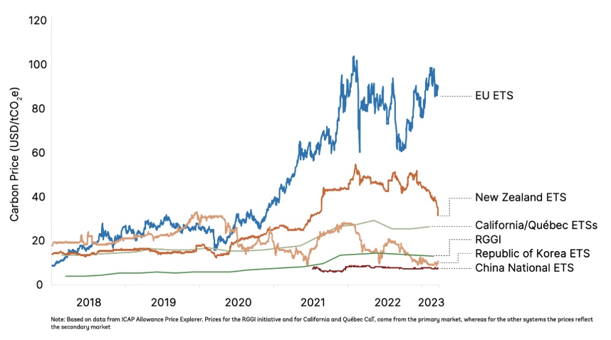 Năm 2023, thế giới đã ghi nhận mức tăng lớn nhất được ghi nhận tại Thị trường EU ETS liên kết với ETS của Thụy Sĩ, với giá ETS của EU lần đầu tiên vượt quá 109 USD vào tháng 3 năm 2023. Ngược lại, nhiều ETS đã chứng kiến giá giảm, trong đó ETS Hàn Quốc đã giảm đến 35%. Chi tiết được thể hiện tại Hình 2.