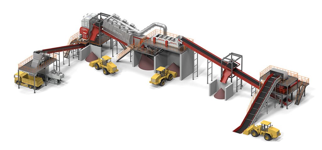 Bằng cách kết hợp các thiết bị chức năng khác nhau, hệ thống có thể phân loại chất thải thành bốn thành phần: đất và mảnh vụn, chất trơ không cháy, kim loại có thể tái chế và chất dễ cháy nhẹ.