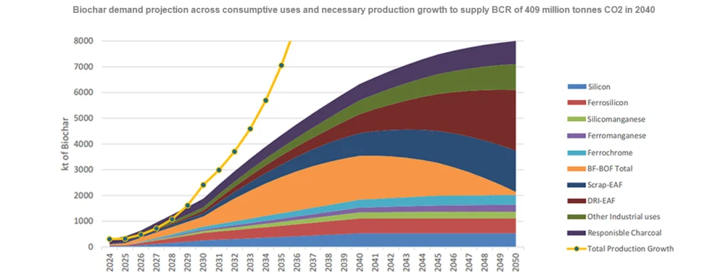 Nhu cầu than sinh học trong ngành luyện kim của châu Âu đang bước vào giai đoạn tăng trưởng nhanh chóng. Sự tăng trưởng này sẽ không diễn ra tự nhiên. Để khai thác hết tiềm năng của than sinh học, châu Âu cần hành động ngay để xác nhận các ứng dụng của nó, đơn giản hóa các quy trình quản lý và hỗ trợ đầu tư vào sản xuất quy mô công nghiệp. Nhìn chung, đến năm 2040, năng lực sản xuất than sinh học sẽ cần đạt 20.6 triệu tấn để đáp ứng nhu cầu carbon tái tạo của ngành luyện kim, tạo ra hiệu ứng carbon ròng tương đương với 400 triệu tấn CO₂ (tức là lợi ích carbon tuần hoàn của than sinh học). Hình dưới đây tóm tắt những dự báo này trên tất cả các ứng dụng công nghiệp, bao gồm silic và hợp kim ferro, thép (cả quy trình BF-BOF và EAF), cũng như các quy trình luyện kim và hóa học khác và việc sử dụng carbon có trách nhiệm.